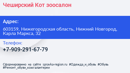 Чеширский Кот, зоосалон по адресу 603159, Нижегородская область, Нижний Новгород, Карла Маркса, 32 в дальнейшем Организация, размещена в следующих категориях: