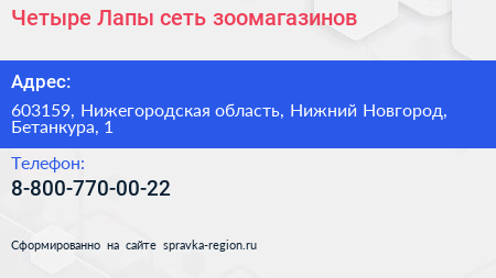 Четыре Лапы, сеть зоомагазинов по адресу 603159, Нижегородская область, Нижний Новгород, Бетанкура, 1 в дальнейшем Организация, размещена в следующих категориях: