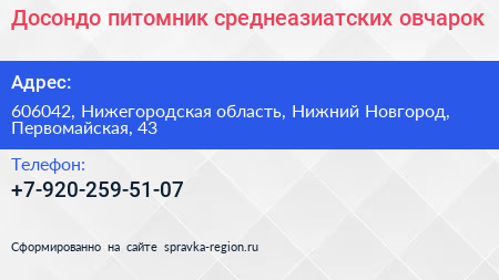 Досондо, питомник среднеазиатских овчарок по адресу 606042, Нижегородская область, Нижний Новгород, Первомайская, 43 в дальнейшем Организация, размещена в следующих категориях: