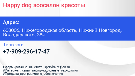 Happy dog, зоосалон красоты по адресу 603006, Нижегородская область, Нижний Новгород, Володарского, 38а в дальнейшем Организация, размещена в следующих категориях: