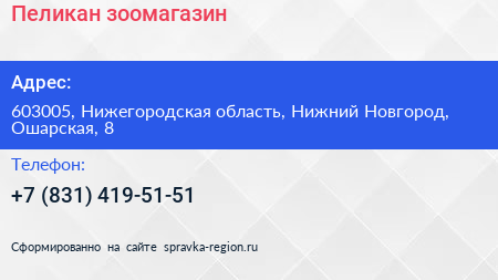 Пеликан, зоомагазин по адресу 603005, Нижегородская область, Нижний Новгород, Ошарская, 8 в дальнейшем Организация, размещена в следующих категориях: