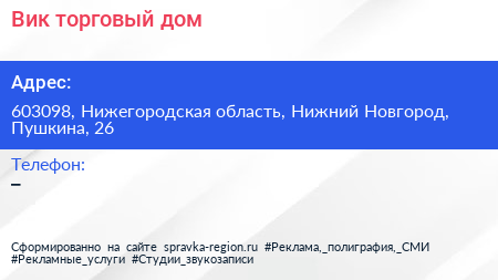 Вик, торговый дом по адресу 603098, Нижегородская область, Нижний Новгород, Пушкина, 26 в дальнейшем Организация, размещена в следующих категориях: