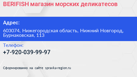 BERIFISH, магазин морских деликатесов по адресу 603074, Нижегородская область, Нижний Новгород, Бурнаковская, 113 в дальнейшем Организация, размещена в следующих категориях: