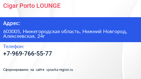 Cigar & Porto LOUNGE по адресу 603005, Нижегородская область, Нижний Новгород, Алексеевская, 24г в дальнейшем Организация, размещена в следующих категориях: