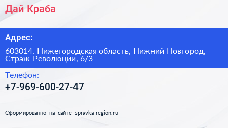 Дай Краба по адресу 603014, Нижегородская область, Нижний Новгород, Страж Революции, 6/3 в дальнейшем Организация, размещена в следующих категориях: