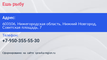 Ешь рыбу по адресу 603106, Нижегородская область, Нижний Новгород, Советская площадь, 7 в дальнейшем Организация, размещена в следующих категориях: