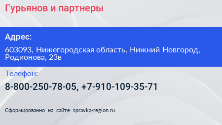 Гурьянов и партнеры по адресу 603093, Нижегородская область, Нижний Новгород, Родионова, 23в в дальнейшем Организация, размещена в следующих категориях: