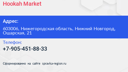Hookah Market по адресу 603006, Нижегородская область, Нижний Новгород, Ошарская, 21 в дальнейшем Организация, размещена в следующих категориях: