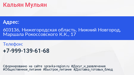 Кальян Мульян по адресу 603136, Нижегородская область, Нижний Новгород, Маршала Рокоссовского К.К., 17 в дальнейшем Организация, размещена в следующих категориях: