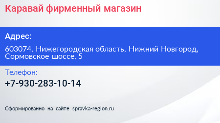 Каравай, фирменный магазин по адресу 603074, Нижегородская область, Нижний Новгород, Сормовское шоссе, 5 в дальнейшем Организация, размещена в следующих категориях: