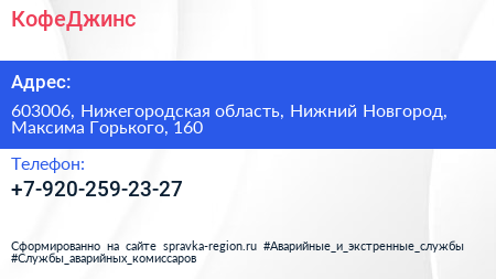 КофеДжинс по адресу 603006, Нижегородская область, Нижний Новгород, Максима Горького, 160 в дальнейшем Организация, размещена в следующих категориях: