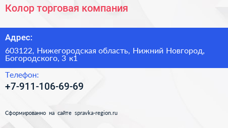 Колор, торговая компания по адресу 603122, Нижегородская область, Нижний Новгород, Богородского, 3 к1 в дальнейшем Организация, размещена в следующих категориях: