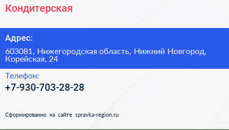 Кондитерская по адресу 603081, Нижегородская область, Нижний Новгород, Корейская, 24 в дальнейшем Организация, размещена в следующих категориях: