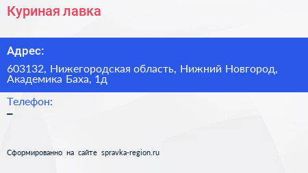 Куриная лавка по адресу 603132, Нижегородская область, Нижний Новгород, Академика Баха, 1д в дальнейшем Организация, размещена в следующих категориях:
