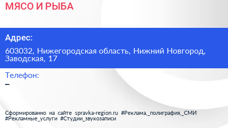 МЯСО И РЫБА по адресу 603032, Нижегородская область, Нижний Новгород, Заводская, 17 в дальнейшем Организация, размещена в следующих категориях:
