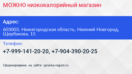 МОЖНО, низкокалорийный магазин по адресу 603003, Нижегородская область, Нижний Новгород, Щербакова, 15 в дальнейшем Организация, размещена в следующих категориях: