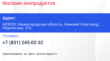 Магазин экопродуктов по адресу 603010, Нижегородская область, Нижний Новгород, Муромская, 37а в дальнейшем Организация, размещена в следующих категориях: