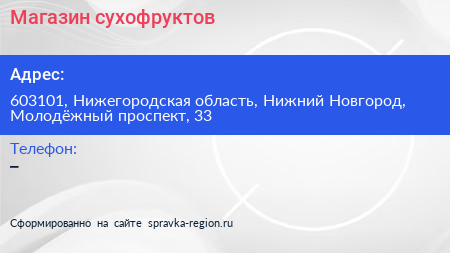 Магазин сухофруктов по адресу 603101, Нижегородская область, Нижний Новгород, Молодёжный проспект, 33 в дальнейшем Организация, размещена в следующих категориях: