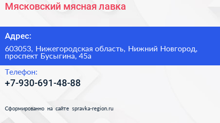 Мясковский, мясная лавка по адресу 603053, Нижегородская область, Нижний Новгород, проспект Бусыгина, 45а в дальнейшем Организация, размещена в следующих категориях:
