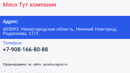 Мясо Тут, компания по адресу 603093, Нижегородская область, Нижний Новгород, Родионова, 17/1 в дальнейшем Организация, размещена в следующих категориях: