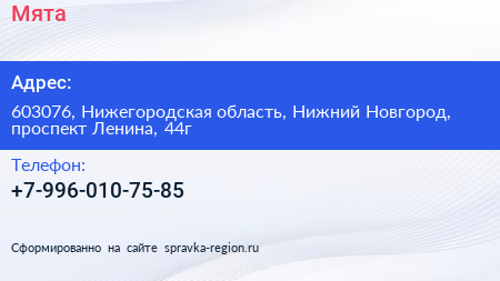 Мята по адресу 603076, Нижегородская область, Нижний Новгород, проспект Ленина, 44г в дальнейшем Организация, размещена в следующих категориях: