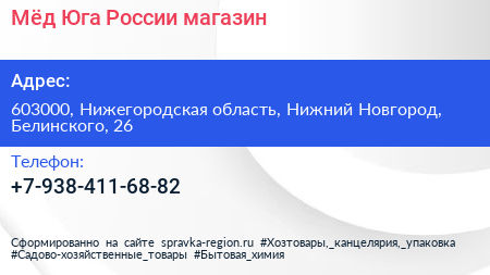 Мёд Юга России, магазин по адресу 603000, Нижегородская область, Нижний Новгород, Белинского, 26 в дальнейшем Организация, размещена в следующих категориях: