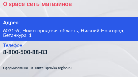 O: spaсe, сеть магазинов по адресу 603159, Нижегородская область, Нижний Новгород, Бетанкура, 1 в дальнейшем Организация, размещена в следующих категориях: