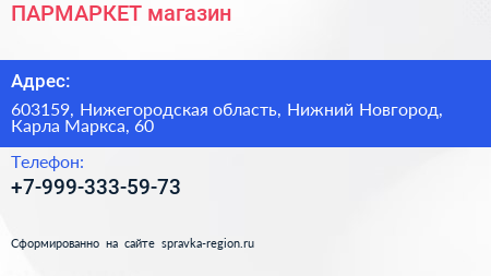 ПАРМАРКЕТ, магазин по адресу 603159, Нижегородская область, Нижний Новгород, Карла Маркса, 60 в дальнейшем Организация, размещена в следующих категориях: