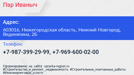 Пар Иваныч по адресу 603016, Нижегородская область, Нижний Новгород, Веденяпина, 2Б в дальнейшем Организация, размещена в следующих категориях: