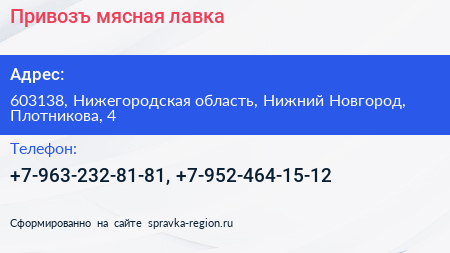 Привозъ, мясная лавка по адресу 603138, Нижегородская область, Нижний Новгород, Плотникова, 4 в дальнейшем Организация, размещена в следующих категориях: