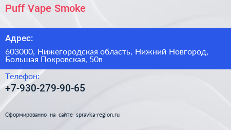 Puff Vape & Smoke по адресу 603000, Нижегородская область, Нижний Новгород, Большая Покровская, 50в в дальнейшем Организация, размещена в следующих категориях: