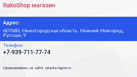 RаkоShop, магазин по адресу 607680, Нижегородская область, Нижний Новгород, Русская, 9 в дальнейшем Организация, размещена в следующих категориях: