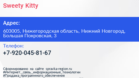 Sweety Kitty по адресу 603005, Нижегородская область, Нижний Новгород, Большая Покровская, 3 в дальнейшем Организация, размещена в следующих категориях: