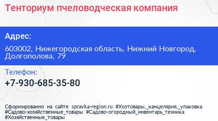 Тенториум, пчеловодческая компания по адресу 603002, Нижегородская область, Нижний Новгород, Долгополова, 79 в дальнейшем Организация, размещена в следующих категориях: