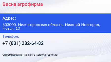 Весна, агрофирма по адресу 603000, Нижегородская область, Нижний Новгород, Новая, 10 в дальнейшем Организация, размещена в следующих категориях: