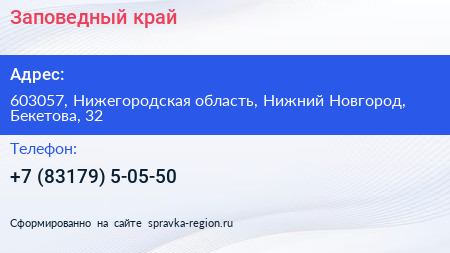 Заповедный край по адресу 603057, Нижегородская область, Нижний Новгород, Бекетова, 32 в дальнейшем Организация, размещена в следующих категориях: