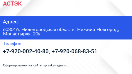 АСТЭК по адресу 603016, Нижегородская область, Нижний Новгород, Монастырка, 20а в дальнейшем Организация, размещена в следующих категориях: