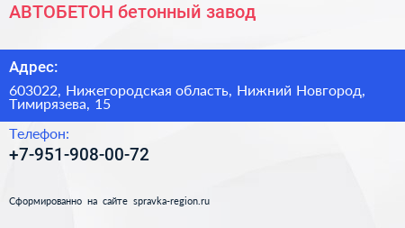 АВТОБЕТОН, бетонный завод по адресу 603022, Нижегородская область, Нижний Новгород, Тимирязева, 15 в дальнейшем Организация, размещена в следующих категориях: