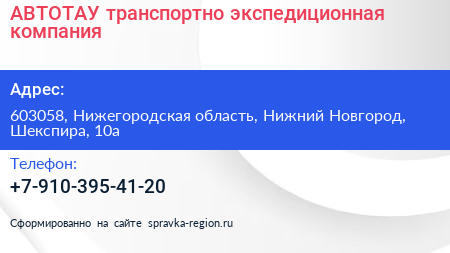 АВТОТАУ, транспортно-экспедиционная компания по адресу 603058, Нижегородская область, Нижний Новгород, Шекспира, 10а в дальнейшем Организация, размещена в следующих категориях: