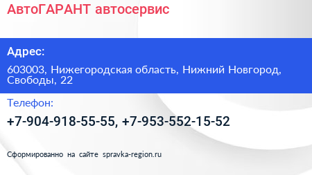 АвтоГАРАНТ, автосервис по адресу 603003, Нижегородская область, Нижний Новгород, Свободы, 22 в дальнейшем Организация, размещена в следующих категориях: