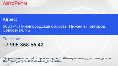 АвтоРитм по адресу 603074, Нижегородская область, Нижний Новгород, Совхозная, 9Б в дальнейшем Организация, размещена в следующих категориях:
