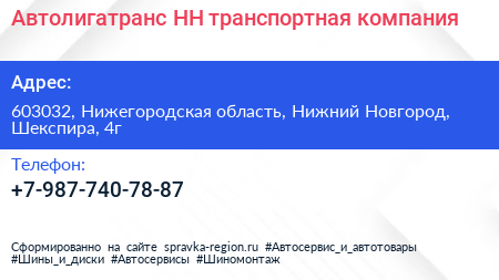 Автолигатранс-НН, транспортная компания по адресу 603032, Нижегородская область, Нижний Новгород, Шекспира, 4г в дальнейшем Организация, размещена в следующих категориях: