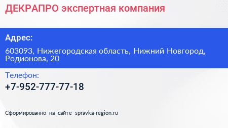 ДЕКРАПРО, экспертная компания по адресу 603093, Нижегородская область, Нижний Новгород, Родионова, 20 в дальнейшем Организация, размещена в следующих категориях: