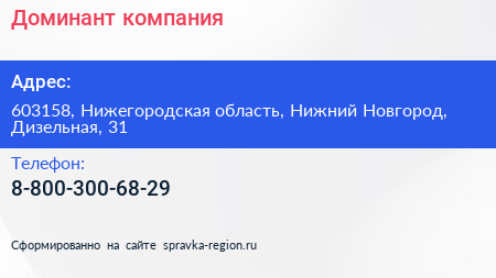 Доминант, компания по адресу 603158, Нижегородская область, Нижний Новгород, Дизельная, 31 в дальнейшем Организация, размещена в следующих категориях: