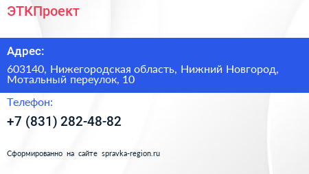 ЭТКПроект по адресу 603140, Нижегородская область, Нижний Новгород, Мотальный переулок, 10 в дальнейшем Организация, размещена в следующих категориях: