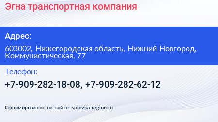 Эгна, транспортная компания по адресу 603002, Нижегородская область, Нижний Новгород, Коммунистическая, 77 в дальнейшем Организация, размещена в следующих категориях: