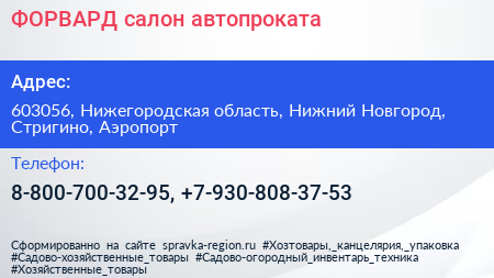 ФОРВАРД, салон автопроката по адресу 603056, Нижегородская область, Нижний Новгород, Стригино, Аэропорт в дальнейшем Организация, размещена в следующих категориях: