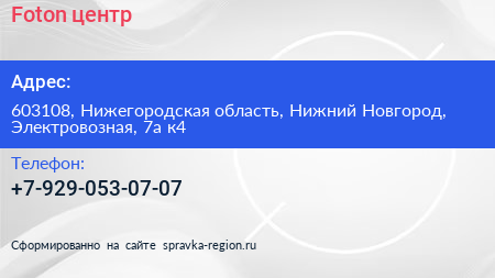 Foton, центр по адресу 603108, Нижегородская область, Нижний Новгород, Электровозная, 7а к4 в дальнейшем Организация, размещена в следующих категориях: