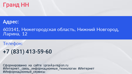 Гранд-НН по адресу 603141, Нижегородская область, Нижний Новгород, Ларина, 12 в дальнейшем Организация, размещена в следующих категориях:
