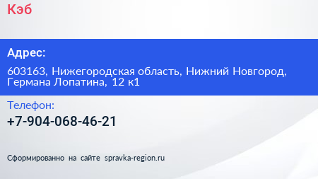 Кэб по адресу 603163, Нижегородская область, Нижний Новгород, Германа Лопатина, 12 к1 в дальнейшем Организация, размещена в следующих категориях: